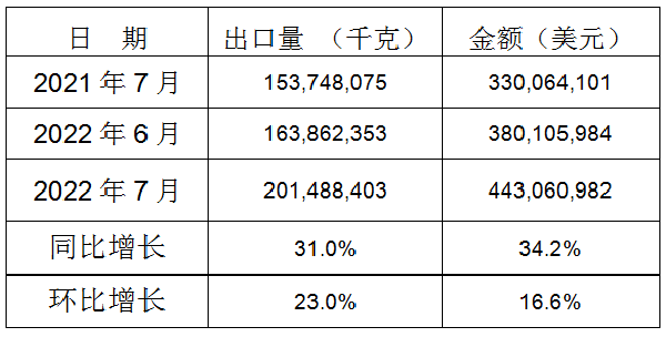 1-7月铸模及铸芯用粘合剂共计出口1.7万吨,同比增长9.8%。其中:7月份出口0.3万吨,同比增长36.0%,环比增长11.1%,见表11和表12。