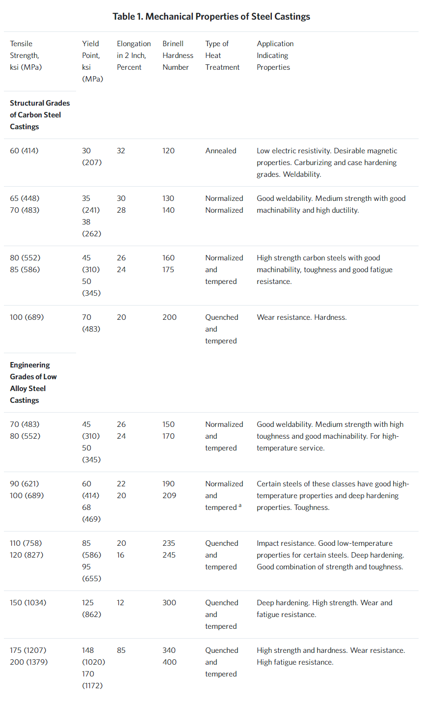 For general information only. Not for use as design or specification limit values. The values listed above have been compiled by the Steel Founders' Society of America as those normally expected in the production of steel castings. The castings are classified according to tensile strength values which are given in the first column. Specifications covering steel castings are prepared by the American Society for Testing and Materials, the Association of American Railroads, the Society of Automotive Engineers, the United States Government (Federal and Military Specifications), etc. These specifications appear in publications issued by these organizations.